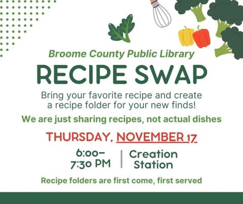 Come join us for a recipe swap! Bring a recipe to share if you want and discover some new favorites. Rather than sharing actual dishes, we will be decorating recipe folders for you to take home. Folders are limited and will be first come, first serve. We can't wait to see you there!