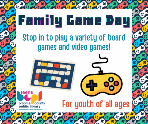 This event is in the "Children" group This event is in the "Families" group This event is in the "Teens" group Family Board Game Night Tuesday, December 23, 2025 at 5:00pm - 6:00pm Storytelling Room at Broome County Public Library Program Type: Gaming Age Group: Children, Families, Teens Join us in the storytelling room for some board games like Checkers, Jenga, Chess, and Taco Cat Goat Cheese Pizza of course! View Details